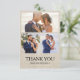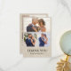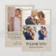 Comparte tu gratitud con estilo con esta elegante tarjeta de agradecimiento de boda de varias fotos que presenta un fondo de textura de lino suave y tipografía serif atemporal. Con espacio para tres retratos de boda favoritos en la parte delantera, junto con una foto y un mensaje sincero en la parte posterior, esta tarjeta está diseñada para complementar bellamente cualquier tema de boda, desde rústico hasta moderno. Personalice con sus nombres, fotos y nota para crear un recuerdo que sus invitados apreciarán.