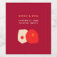 Esta etiqueta floral de personalizable muestra dos formas orgánicas circulares unidas en rojo y crema, simbolizando el amor, la pareja y el matrimonio. El fondo es de color burdeos y se inscriben las siguientes palabras: nombre de la pareja y fecha y lugar del boda.