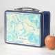 Una elegante y sofisticada caja de mediodía con un elegante patrón de mármol falso con colores turquesa en tonos azul turquesa y crema. Un marco de color crema con un borde dorado sobre el techo con un nombre personalizado en el interior.