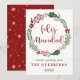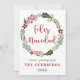Corona de Navidad verde y roja en tarjeta de vacaciones, con las palabras Feliz Navidad en español: Feliz Navidad.