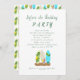 Invitación a la fiesta de bodas en Surfboard. Celebrar antes del boda, o después del ensayo, con una reunión de amigos y familiares. Diseño artístico de tablas de surf divertidas con tres tablas de surf en imagen de arena en la parte delantera. El texto de las plantillas es fácilmente personalizar y se imprime en color verde oscuro. El inverso tiene un patrón de tabla de surf.