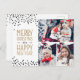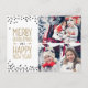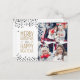 Navidades festivos saludando el diseño de tarjetas con elementos de nieve modernos blancos y negros. Un elegante y grande texto de tipografía dorada en el frente con "Feliz Navidad y un feliz año nuevo". Y un elegante marco de collage de fotos para 3 fotos personales y fotos de la familia. Crea este popular diseño desde Luckz.