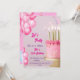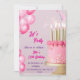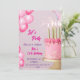 Un elegante diseño de invitación de fiesta de cumpleaños con un tema rosa y dorado. El centro de atención es un hermoso pastel rosa decorado con velas doradas y sprinkles en forma de estrella. Los globos de acuarela rosa añaden un toque festivo, mientras que el texto resalta el tono de celebración con fuentes elegantes. Perfecto para celebrar un cumpleaños número 13.