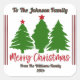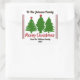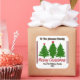 Un delicioso pegatina cuadrado adorna un regalo bellamente envuelto, con vibrantes árboles verdes y un alegre mensaje de Feliz Navidad. Este acento colorido añade un toque festivo, perfecto para compartir el amor y la celebración durante las vacaciones.