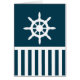 Diseño náutico con rueda de vela y decoración de rayas azules y blancas en fondo azul