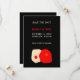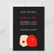 Este personalizable salva la tarjeta de fecha muestra dos formas orgánicas circulares unidas en rojo y crema, simbolizando el amor, la pareja y el matrimonio. El fondo es negro y se inscriben las siguientes palabras: "guardar la fecha", los nombres de la pareja, la fecha y el lugar del boda y la "invitación a seguir". La parte posterior tiene el mismo ilustracion, que se puede modificar.