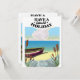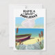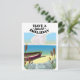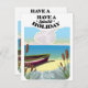 Disfrute de unas vacaciones espléndidas, un barco de pesca en un cartel de viaje de playa de arena de estilo vintage.