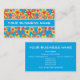Una tarjeta de visita de bonito para muchos tipos de negocios, con un patrón general de flores rojas, naranjas y amarillas sobre un fondo turquesa brillante, de un collage de papel pintado a mano de Judy Adamson. Personalizable completo y fácil.