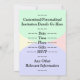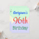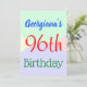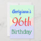 Este diseño básico de la invitación para fiestas de cumpleaños incluye un mensaje como "Cumpleaños 96 de Georgiana", donde se puede personalizar el nombre y el número de cumpleaños. También cuenta con un entorno divertido y multicolor. Los detalles del evento en la parte posterior se pueden personalizar. Se podría usar para invitar a la gente a la celebración de cumpleaños número noventa o a la fiesta de cumpleaños. [~Z0000311]