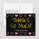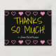 Este divertido diseño de tarjetas postales de agradecimiento incluye el mensaje "¡MUCHAS GRACIAS!" en la parte delantera, junto con un mensaje de personalizable en la parte trasera. También presenta formas cardíacas decorativas. Se podría usar para mostrar aprecio a alguien que ha hecho algo especial.