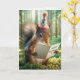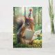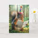 Una ardilla se levanta en un bosque iluminado por el sol, llevando un gorra festivo fiesta mientras sostiene una tarjeta de cumpleaños. Se puede cambiar el texto interno.