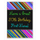 Este divertido, colorido y caprichoso diseño de tarjetas de felicitación con temática de cumpleaños presenta un cálido deseo de cumpleaños como "¡Ten un gran cumpleaños número 50, nombre!" en la parte delantera. El nombre del frente puede ser personalizado. La parte superior e inferior de la parte delantera presenta un patrón de rayas multicolor y vibrante. El interior incluye un mensaje de cumpleaños que se puede personalizar. Una tarjeta de felicitación como esta podría ser una manera divertida de ofrecer deseos de cumpleaños a alguien que está celebrando su quincuagésimo cumpleaños. [~Z0000269]