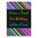 Este divertido, colorido y caprichoso diseño de tarjetas de felicitación con temática de cumpleaños presenta un cálido deseo de cumpleaños como "¡Ten un gran tercer cumpleaños, nombre Personalizado!" en la parte delantera. El nombre del frente puede ser personalizado. La parte superior e inferior de la parte delantera presenta un patrón de rayas multicolor y vibrante. El interior incluye un mensaje de cumpleaños de personalizable. Una tarjeta de felicitación como esta podría ser una manera divertida de entregar deseos de cumpleaños a alguien que esté celebrando su tercer cumpleaños. [~Z0000269]