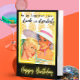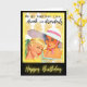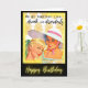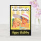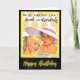 Divertido diciendo tarjeta de cumpleaños a la muje