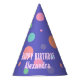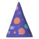 Gorras de fiestas violetas con una alegre dispersión de coloridos puntos de polka y las palabras Feliz cumpleaños escrito en rosa.