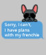 Esta graciosa sudadera francesa tiene un lindo bulldog francés azul con un mensaje de texto que dice "Lo siento, no puedo, tengo planes con mi francesa". Este lindo suéter también está disponible con diferentes bulldoges franceses de colores en diseños masculinos y femeninos.
