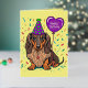 El divertido perro perrito dachshund de pelo largo con un globo de cumpleaños al corazón es popular entre los amantes del perro dachshund y los amantes de las mascotas por celebrar cumpleaños.