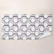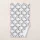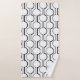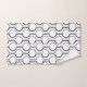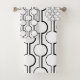Esta cortina de ducha tiene un diseño moderno de mediados de siglo de círculos en división en negro por la mitad y en líneas sobre un campo de blanco.