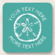 Conjunto de dólares de arena concha de playa plástico posavasos para bebidas. Agregue su propio texto personalizado. Diseño vintage elegante con tipografía elegante. Azul teal y blanco o color personalizado. Ideal para casa de playa, fiesta de boda de verano, cena, cumpleaños, etc. Imagen rústica de concha de mar. Forma cuadrada con respaldo de corcho antideslizante.