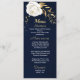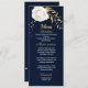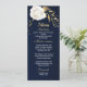 bellas flores blancas y hojas de oro elegante menú boda azul marino. Los detalles del purpurina se simulan