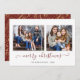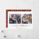 Red Gold Simple Script Modern Merry Christmas Photo Card con dos de tus fotos favoritas y un sencillo pero elegante guión Feliz Navidad. La parte trasera está decorada con un estampado festivo y elegante de hojas de Relieve metalizado dorado, pino y otras plantas botánicas de invierno sobre un fondo rojo invernal. ¡Perfecto para tus tarjetas de vacaciones este año! Póngase en contacto con nosotros en cedarandstring@gmail.com si necesita ayuda con el diseño o productos de coincidencia.