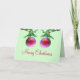 Tarjeta de saludo con mi diseño de dos bolas de Navidades rojos con reflejos de las ramas del árbol de Navidad en las que están colgando. El texto dice "Feliz Navidad".