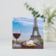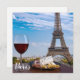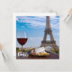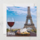 Dos copas de vino tinto con tentempiés con vistas a París y la Torre Eiffel. Vidrio de vino tinto con diferentes tentempiés - plato con jamón, rebanado, queso azul. Pareja, celebración romántica