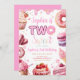 ¡Celebra tu dulce hito con esta adorable invitación de cumpleaños "DOS dulces"! Perfecto para un fiesta de 2º cumpleaños de un chica, esta invitación editable presenta un divertido tema de postres rosados con donuts, pastelitos, helados, macarones y rociadores, todo en unos colores pastel de ensueño.