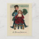 Diseñado por Susan Epps Oliver. Imagen vintage de Navidad de dos niños montando en un trineo. La niñita tiene una bufanda blanca para mantener sus manos calientes. El niño que está detrás de ella tiene un regalo para los Navidades y un poco de holly.