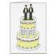 Dos novios personalizados vestidos con trajes de cuero y encima de un limón de varios niveles y un pastel blanco.