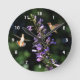 Dos hermosos colibríes volando con un reloj de pared de flores moradas