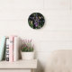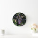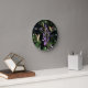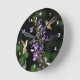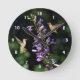 Dos hermosos colibríes volando con un reloj de pared de flores moradas