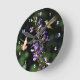 Dos hermosos colibríes volando con un reloj de pared de flores moradas