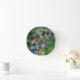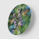 Dos hermosos colibríes volando con un reloj de pared de flores moradas
