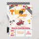Amplíe a sus huéspedes con esta invitación de dos Carreras rápidas para el cumpleaños del coche. La tarjeta incluye un fuego de quema de ruedas calientes, una bandera de trofeo y damero, y un auto deportivo con colores brillantes Para el fondo, un auto está arrancando la bandera a cuadros mientras está en la línea de cierre. Simplemente agregue los detalles de su evento en esta plantilla fácil de usar para convertirla en una invitación única Consulte la tienda para ver los elementos coincidentes