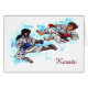 un abstracto ilustracion colorido de color acuático de dos hombres con trajes de karate, guantes y cinturones de lucha rojos y azules, saltando al aire y peleando entre ellos en una batalla del torneo; la imagen es dibujada a mano con tinta y coloreada con acuarela, refinada por la computadora. Una obligación para los fans del karate y las artes marciales y para los que quieren convertirse en.