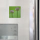Un imán de flores silvestres hermoso pero sencillo con dos flores tipo allium sobre un fondo verde con un toque de bokeh.