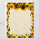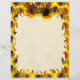 Dos girasoles amarillos brillantes. Fotografía floral, tomada en la primavera de 2009 en Corralitos, California. Se coloca sobre un fondo amarillo brillante de girasoles. Papel de membrete en blanco con borde de llama estilizado.