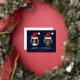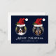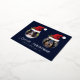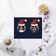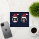 Diseño de plantillas de fotos de Navidades personalizables para dos fotografías. Hay un ilustracion rojo de Santa hat de Destei colocado encima de cada foto redonda. El sombrero de Santa tiene una planta de Navidades verdes Holly y el color de fondo es azul. Bajo la imagen hay dos áreas de texto personalizables que se colocan en el área de diseño del Relieve metalizado.