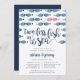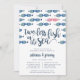 Las invitaciones a las cenas de verano de nuestra moda costera incluyen una escuela de pescado en tonos azules, con un par de besos de pescado en contraste con la rosa de coral. "Dos menos peces en el mar" aparece en letras de caligrafía de pincel, con los detalles de tu ceremonia de ensayo y cena o celebración debajo.