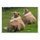 Fotografía de vacas marrón claro y blancas con cuernos reposando en un pasto con la espalda hacia la cámara.