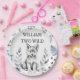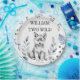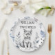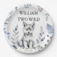 Dos platos de fiesta personalizados para la fiesta de cumpleaños con temática de lobo salvaje, un lindo lobo gris esponjoso y algunas hojas del bosque para una fiesta de cumpleaños de los bosques de lobos