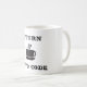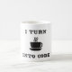 Una taza blanca clásica con una imagen de una taza de café y los textos "que DOY VUELTA" arriba y "EN CÓDIGO" debajo de la taza. Muestre lo que usted necesita ser productivo como codificador.