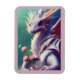 Este imán adorable muestra a un mítico dragón blanco sosteniendo un ramo de flores rosas.