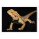 Un curioso dragón barbudo mirando hacia adelante frente a un fondo negro.