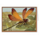 una maravillosa libélula vintage descansando sobre una hoja. el insecto tiene tonos dorados y marrones y el fondo muestra un pantano con agua y lilíparas.