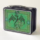 Dragón negro tribal con nudos celtas verdes trabajando alas. Los tonos de nudo verde y celta funcionan detrás y alrededor del dragón y del trébol de cuatro hojas.