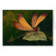 Maravillosa libélula vintage descansando en una hoja. El insecto de libélula tiene tonos dorados y marrones y el fondo verde profundo muestra los patrones de hojas.
