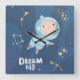 Dream Big Boy Astronaut Acrylic Wall Clock muestra a un niño astronauta explorando las estrellas y constelaciones. El texto blanco que sigue dice: "Sueño Grande". Es el reloj perfecto para la guardería de tu pequeño soñador.