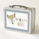 El diseño de la caja de almuerzo de arte folclórico de estilo escandinavo adorable presenta gráficos de zorro dulce y letras que deletrean DREAM BIG con fondo gris
